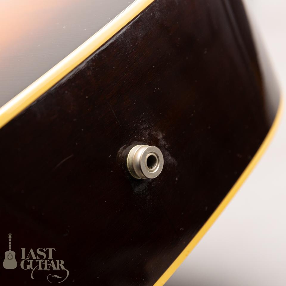 本機は、2004年製で、ウェザーチェックがトップにバリバリと入って貫禄ある風貌に育っております。渋いサンバーストカラーとマッチングしてすごく良い表情をしております。色づいたバインディングやペグボタンも雰囲気があります。シルクスクリーンロゴ、シングルのサウンドホールリング、スモールピックガード、白ボタンペグと王道のスタイルはやはりシンプルですごくカッコいいです。