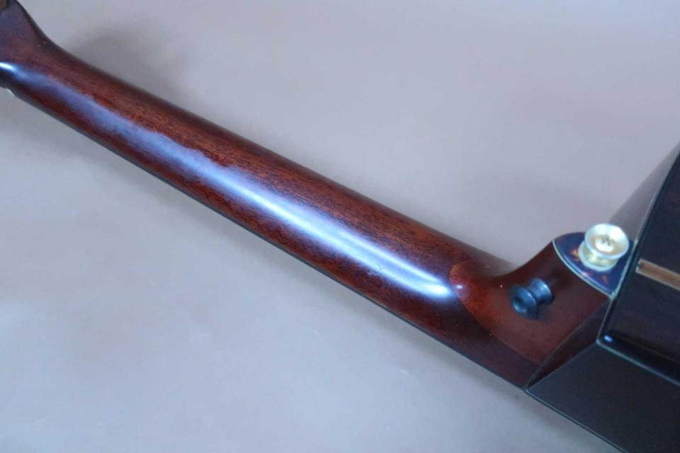 サウンドは初代のスキャロップドXブレイシングが採用され、後期のダブルXブレイシングでは無く王道のブレイシングが採用された初期モデル。軽いタッチでも音の立ち上りが良く、低域もスケール感の有る伸びやかな鳴りと、煌びやかで艶やかな透明感の有る高音域はピッカーには是非お試し頂きたい逸品です。状態はトップのカッタウェイに軽い塗装上の打コンとサウンドホール左にも軽微な打コンは見られますが使用感は年代から考えれば少なく、サイドやバックは目立つダメージも見受けられず擦り傷程度です。ネック裏の1F裏に小さな打コンと元々薄いマットな仕上げで使用によるテカリは見受けられますが演奏で気にならないと思います。ネックヒールにダブルでストラップピン増設済み、ピックアップもB-BAND CORE99搭載でステレオコードでピエゾとコンタクトマイクのミックスが可能ですが、現状は通常のモノラル・コードでピエゾの出力のみです。(ステレオコードか、Y字ケーブルの場合は、ピエゾとマイクの出力で外部に2chミキサー等が必要です)。ネック幅44.5mmで弦高も12F6弦で約2..3mm、1弦約1.6mm、サドルの余裕も約3mmあり、ネックを含めプレイヤビリティも良好でフィンガー系プレイヤーにオススメです。オリジナルギグケースが付属しています。中古市場でも玉数の少ないプレイヤー向きのお買得品です!