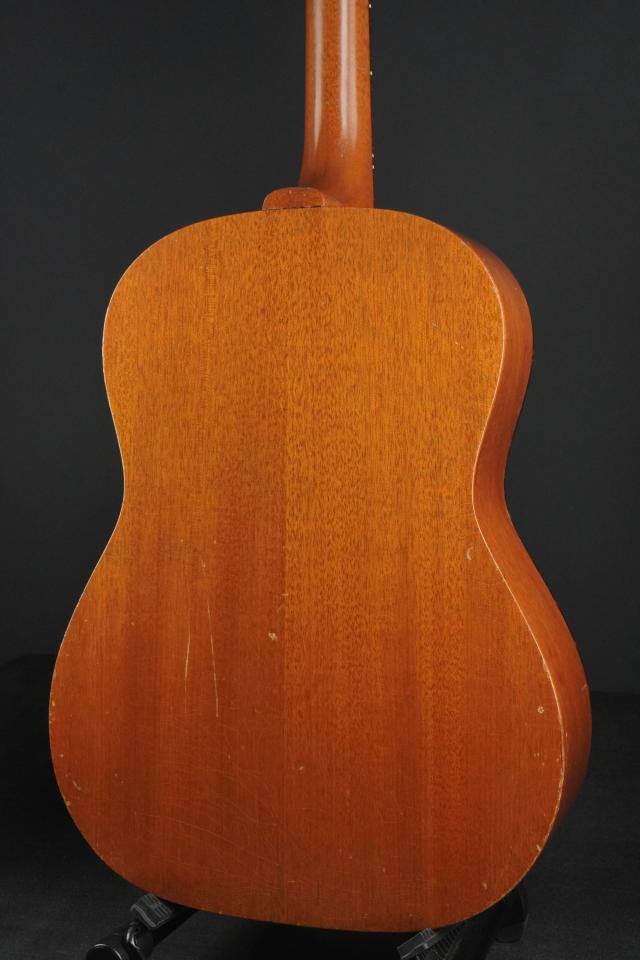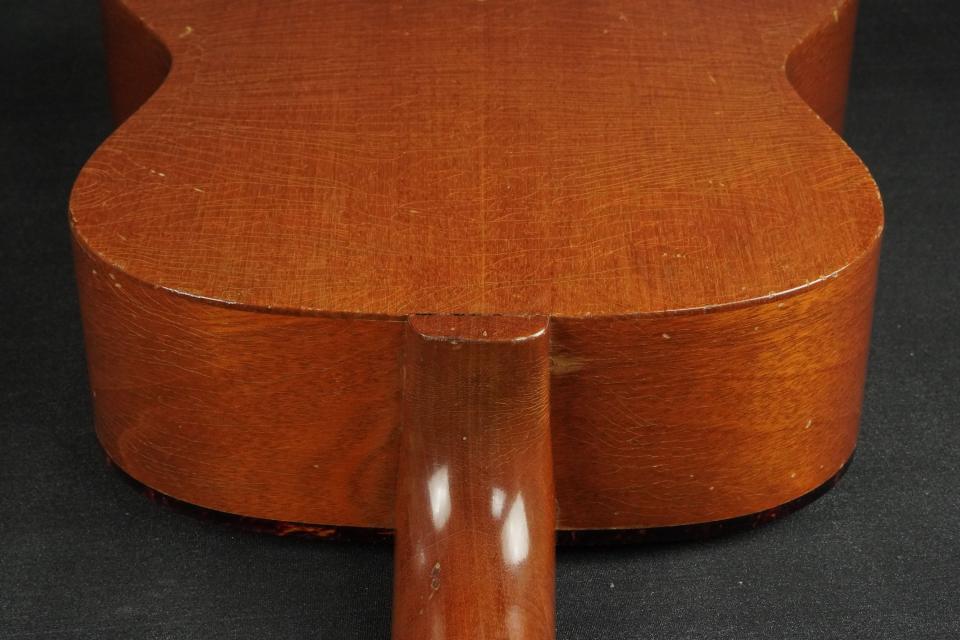 程良くアンティークに色焼けしたオールマホガニーのボディには渋く使い込まれた雰囲気でウェザーチェックが入り、この時期ですとプラスティックブリッジ仕様でしたが、現在はローズウッドで作り直されております。