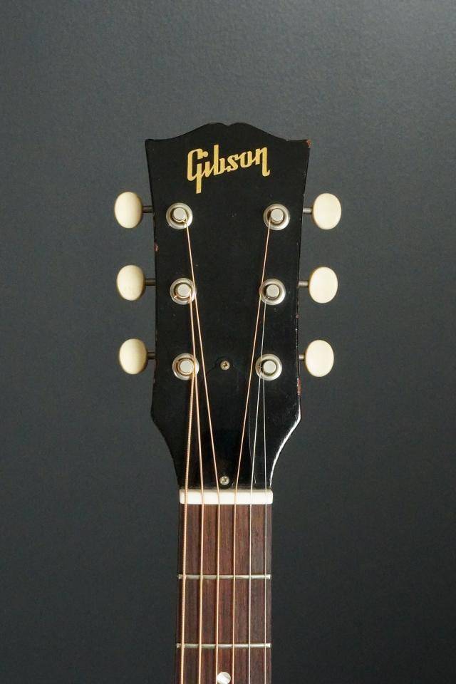 ナット幅が約42mmですが薄めで細身に感じる握り易いネックグリップで弾き易く、マホガニーボディとラダーブレーシングからのコロコロと明るい抜けの良いサウンドで、よく乾いた軽やかな鳴りが心地良く、ストロークで掻き鳴らすとギブソンらしい中域の暖かなトーンがジャキジャキっと派手に鳴ってくれますので、ブルースや弾き語りにぴったりな気軽にヴィンテージサウンドが楽しめます。