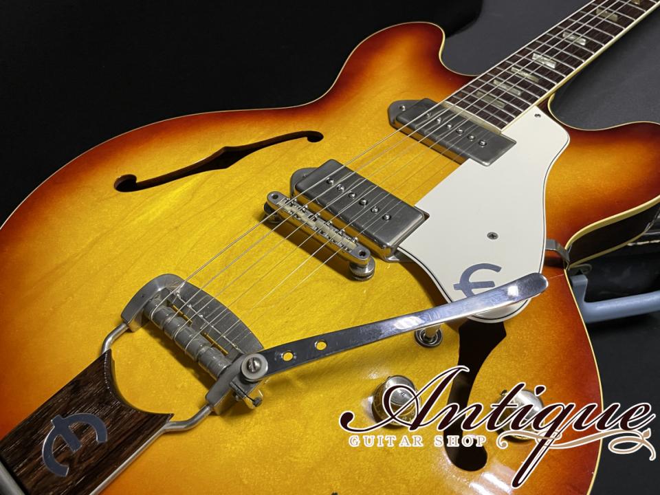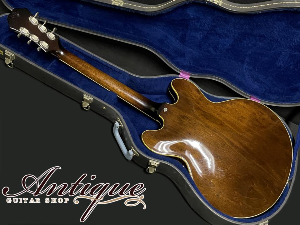 Epiphoneブランドは1957年にはGibson社に経営権が移り、既存のGibsonのモデルのローエンド・バージョンとして位置付けられ、当時Gibson社から販売されていたES-330モデルが330ドルであったのに対し、E-230(Casino)モデルは230ドルで販売されていました。その後1958年7月のNAMMショーにて、仕切り直しのかたちで大きく披露され、そこにはセカンドブランドという意味ではなく、経営権は同じ会社ながら別のアイデンディティを持った2つのブランドとして確立していきます。そして1964年にイギリスのブルース・ロック・ブームを牽引してきたジョン・メイオールに勧められ、ポール・マッカートニーがビートルズとして初めてのCasinoを入手する事となります。続いてその素晴らしいサウンドに魅せられたジョージハリスンが1965年にCasinoを入手、続いて1966年にジョンレノンが入手し、ビートルズの代名詞となるギターとしてその名を世界に知らしめます。