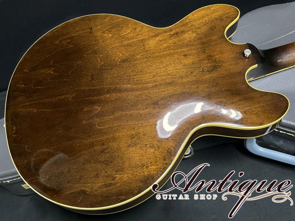 今回ご紹介させて頂くのは、そのジョージハリスンが愛用したCasinoとほぼ同時期に製作されたと思われる非常にレアな拘りの仕様をもった1964-1965年製。フィニッシュのサンバーストの色合いが本人所有機に近いというだけではなく、ボディシェイプのくびれ、ネックがワイドナットではなく、41mmナット幅のスリムシェイプ、ヘッドの面取りがキレイにされている治具がすり減る前のシェイプと、ジョージの愛機に限りなく近いルックス&ドンズバスペックの一本。(ジョージは入手後にBigsbyトレモロに換装)併せてパーツは全て当時から変更歴無しとなるハンダバージンのフルオリジナル、状態も60年の歳月を全く感じさせない極上美品コンディションをキープした、コレクタブルアイテム。ヴィンテージファンの中でも有名なVintage Maniacsのサイトにも掲載された特別な一本になります。