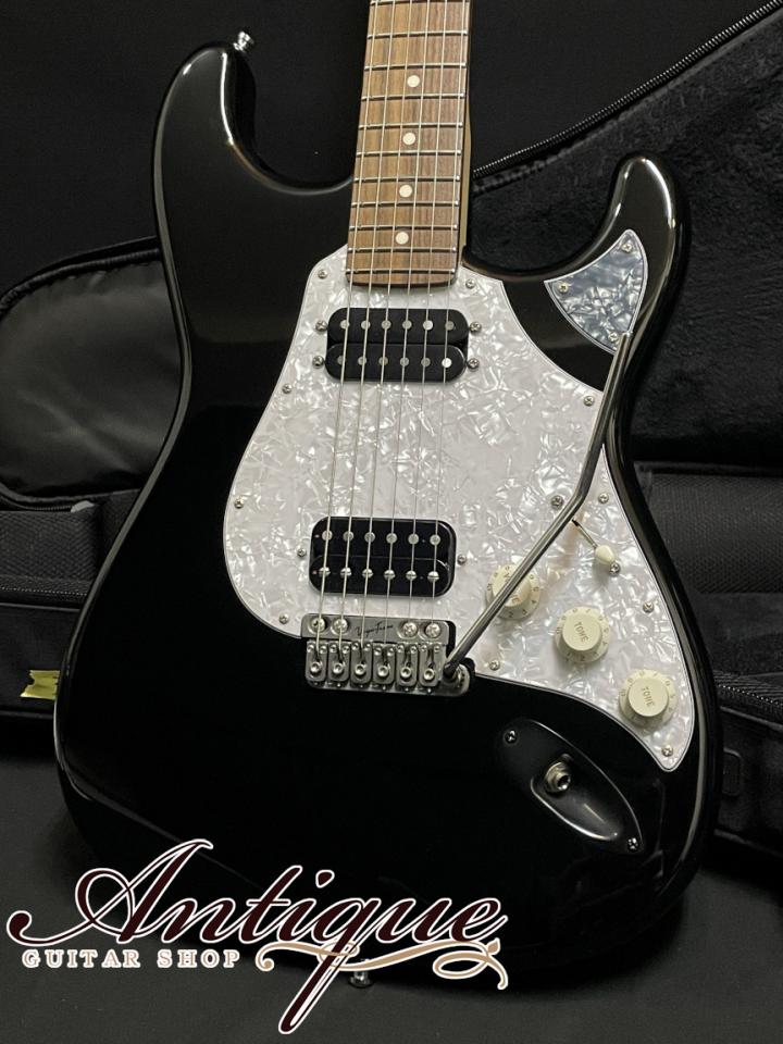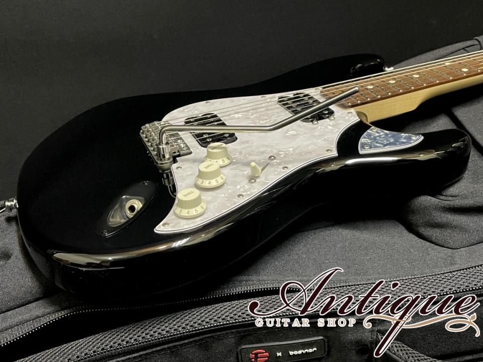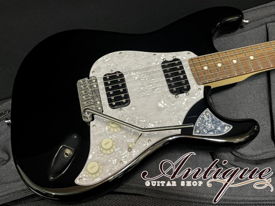 まずそのスペックとしては、ストラトをベースとしたオリジナルシェイプにて、ボディには軽量かつ音響特性の良いアッシュ材を採用。総重量は約3.41kgと非常に取り回しの良い一本となっております。フィニッシュカラーは高級外車を彷彿させるグロスブラックカラー。ネックにはサウンド面と強度面の双方をカバーする追い柾目寄りの木取りにて、薄っすらとフィギュアドも感じる良質なメイプルが採用されております。指板材のローズウッドも非常に色濃くダークなコントラストかつ強い黒の杢目が走るハカランダさながらの素晴らしい材となっております。その他としては、オリジナルスタイルのピックガードはメインがホワイトパールにてホーン部はブラックパールが採用された2トーン仕様。トレモロユニットは2020年のNAMMで見つけたというスペイン製のVega Trem VT1を搭載。チューナーは精度に高い定評のあるヴィンテージスタイルのGotoh製 SF91-05-M、ジョイント部は4点留めながら、3点留めプレートを採用しヒールレスカットが施された独自のスタイル。ヘッドはレイヤードにブラックパールのヘッドガード仕様。細部スペックとしては25 1/2”のロングスケール、マット仕上げのModern Cシェイプ、ミディアムフレット(Jescar #47104)の22F仕様に12”ラディアス、オイルボーンナット、シャーラーロックピン等々、クールなルックスだけでなくプレイヤー目線でサウンド&プレイアビリティ共にシッカリと考慮された拘りのスペックとなっております。