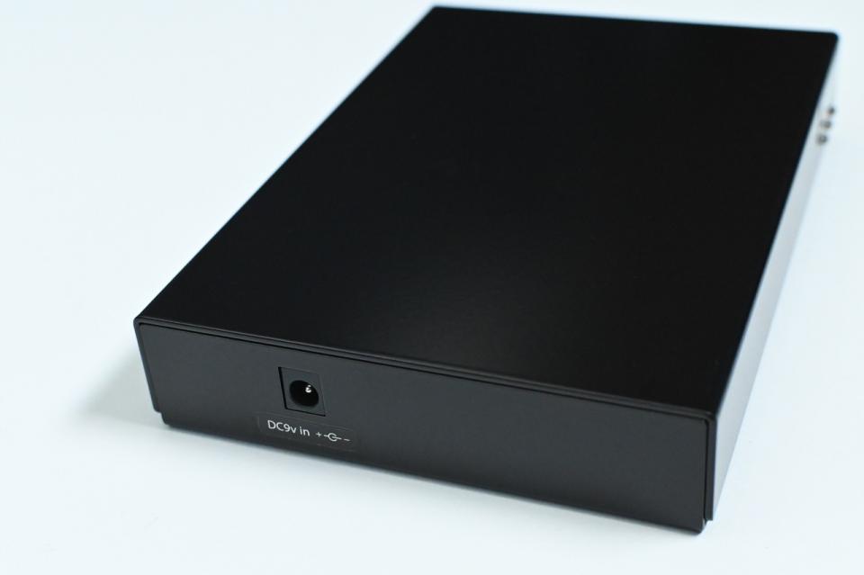 側面にDC9Vセンターマイナスのアダプターを接続し、電源供給を行うと、前面のグリーンのLEDが点灯します。
