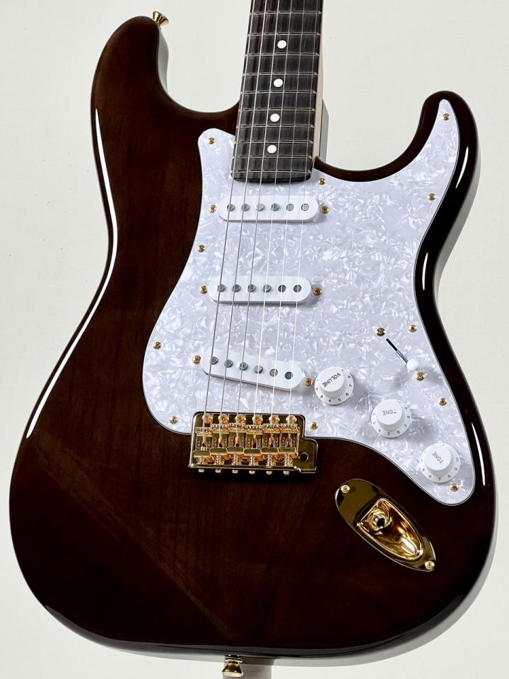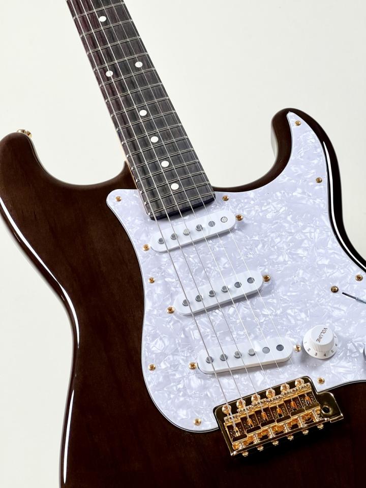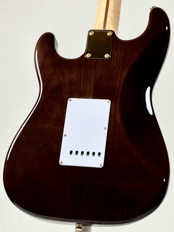 アルダーの杢目が見えるシースルーブラックカラーにゴールドハードウェアを採用したゴージャスなルックスが目を惹く1本です。