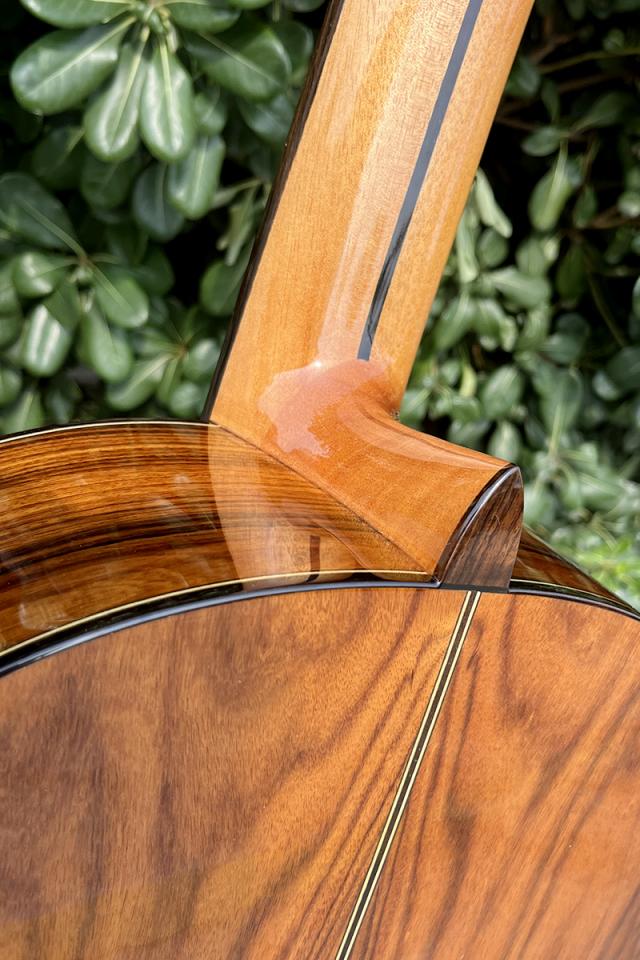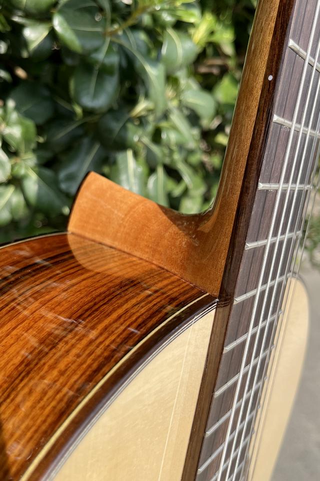 新しくアームレストを備えたモデルが新発売になりました。右肘内側と接するボディ部分がラウンドしており、あたりが優しく右腕の移動もスムーズで、長時間の演奏でも痛くなりません。アームレスト部分の作りが美しく存在感があります。