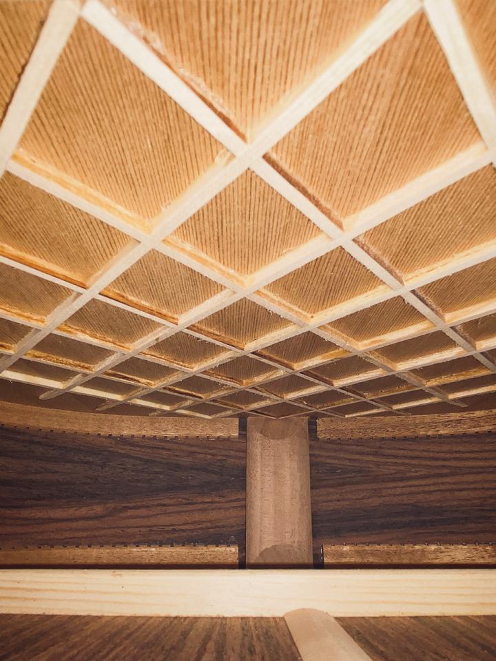 クラシックギターの表板のブレーシング(補強)の種類で格子状(Lattice)にブレーシングが配置されているものになります。ラティスブレーシングのギターは音量が大きく、倍音が豊かなクリアで明るい音色を生み出します。低音域〜中音域の豊かさと高音域の明瞭さ、サスティン(音の伸び)が良いのが特徴です。