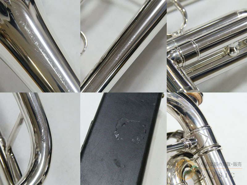 また、ベルに擦れ傷、ベル奥に擦れ傷やメッキ浮きや小傷、ベルフレアに写真に写らない程度の打痕、ベル縁に打痕がございます。ケースの底面にシールの貼り痕がございます。