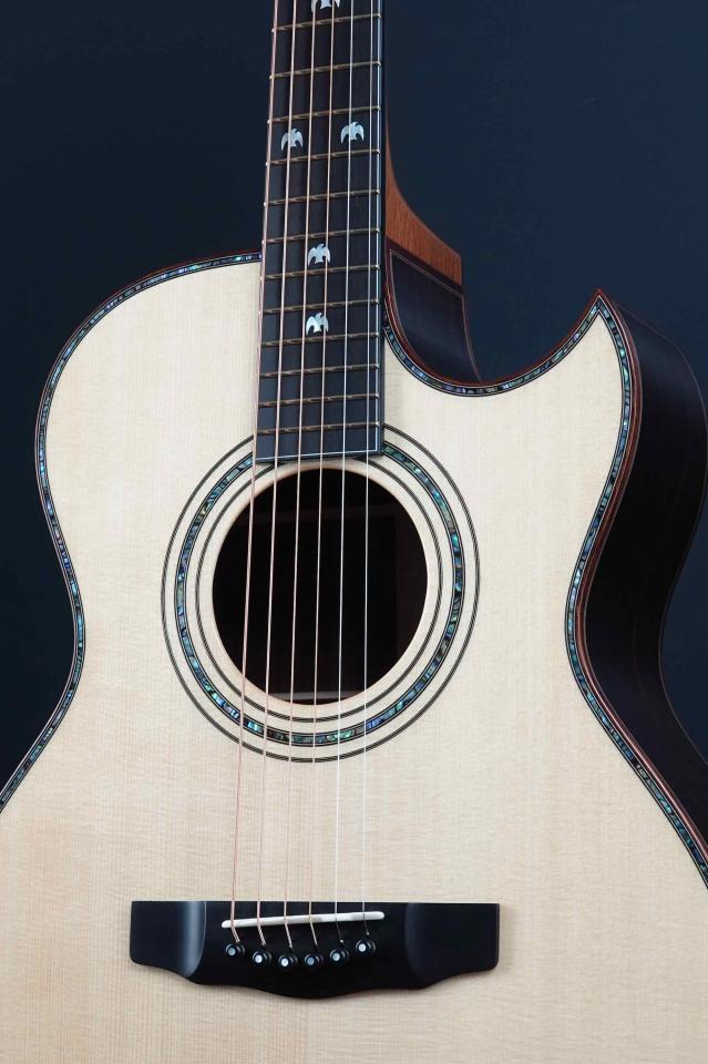 クリーミーな色白のトップ材に、パウアアバロンを使ったロゼッタやパーフリングのインレイがとても鮮やかです。