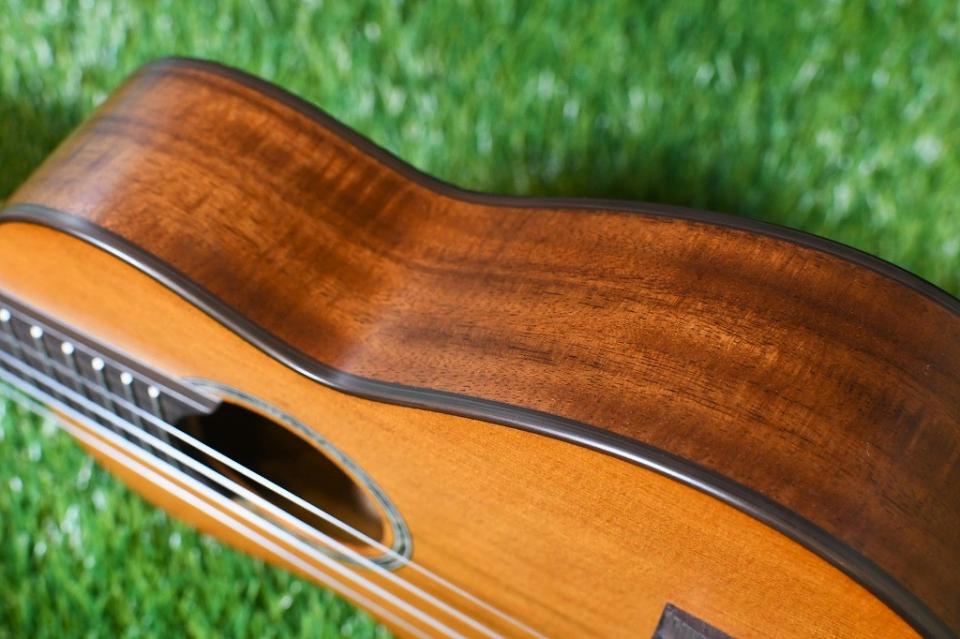 木の質感のある素朴なルックスながら、ブラックカラーのバインディングやロゼッタのアバロン装飾で、高級感が漂います。