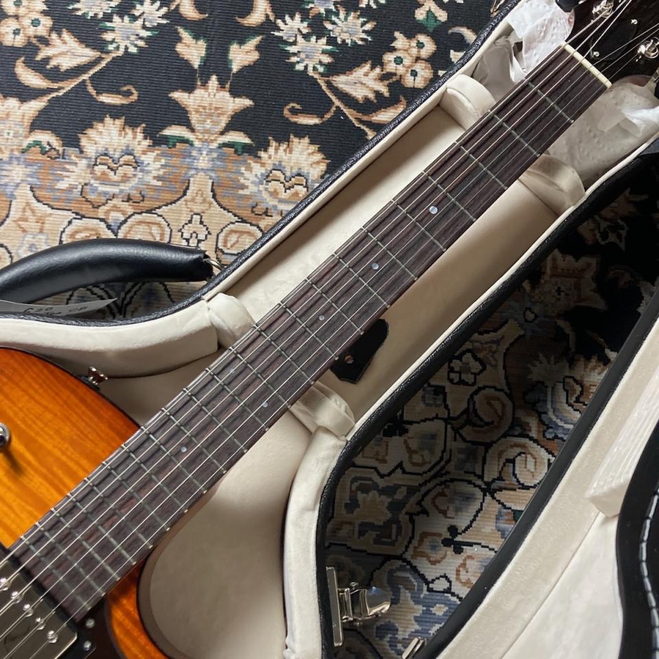 落ち着いたTea Burstカラーに美しいフレイム杢を持つプレミアムグレードのメイプルトップ、厳選されたホンジュラス・マホガニーを削り出したボディーにメイプルのセンターブロック構造。 24 7/8"スケールを採用し、深く強固にセットされたホンジュラス・マホガニーのネックにはダークカラーのローズウッド指板が使用されています。
