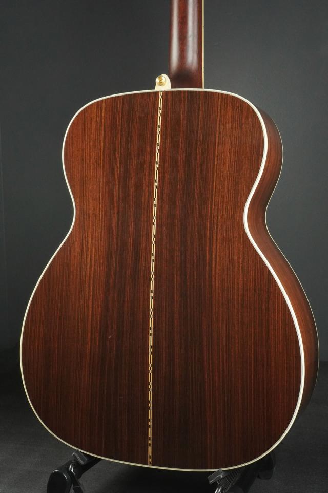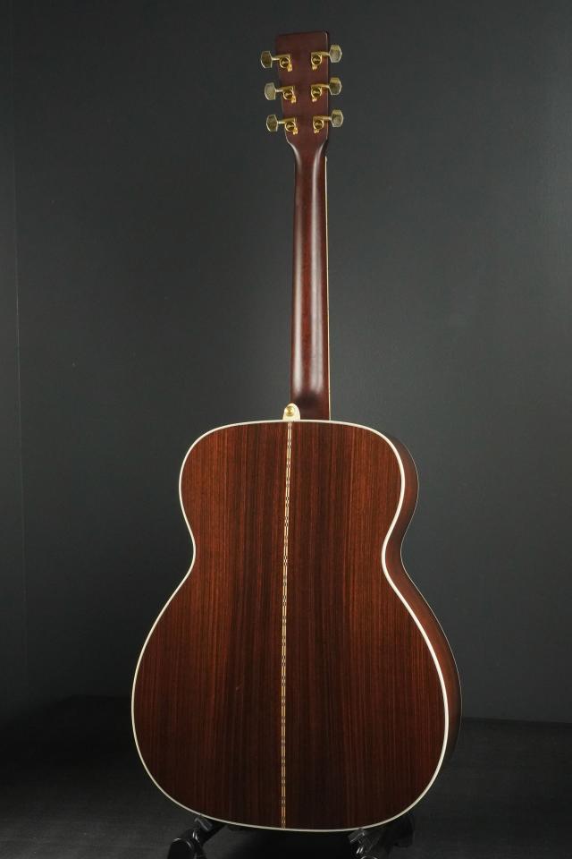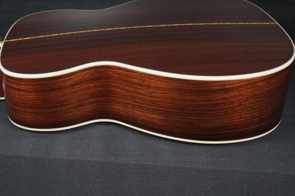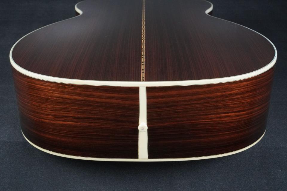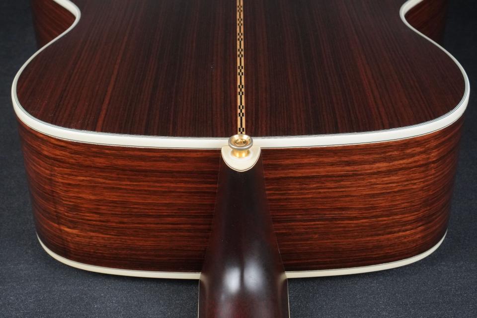 ロゼッタは28モデルと同じセルのパターンで、黒いオリジナルのピックガード、エボニーのブリッジにはスロットインのショートサドル、トップのトリムは8層の多重セルで重厚なスペックになっております。