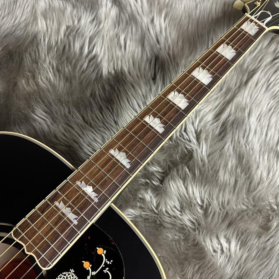 サーマリーエイジド処理が施されたソリッドスプルース・トップ、スキャロップトX ブレーシング、ソリッドフィギュアードメイプルのバックとサイド、C プロファイル・シェイプのフレームメイプル・ネック、ローレル指板、マザーオブパールによるクラウン・インレイ等、充実の仕様を誇ります。ギブソンスタイルのオープンブック・ヘッドストックには、マザーオブパールによるクラウン・インレイとエピフォン・ロゴのインレイが施され、ヘッド裏にはInspired by Gibson Custom のダブルダイヤモンド・ロゴが刻まれています。J-200 モデルの象徴ともいえるオープンマスタッシュ・ブリッジとエングレーブ処理が施されたピックガードが目を引きます。L.R.Baggs VTC プリアンプとアンダーサドル・ピックアップを装備し、スタジオやステージで即座に使用できます。