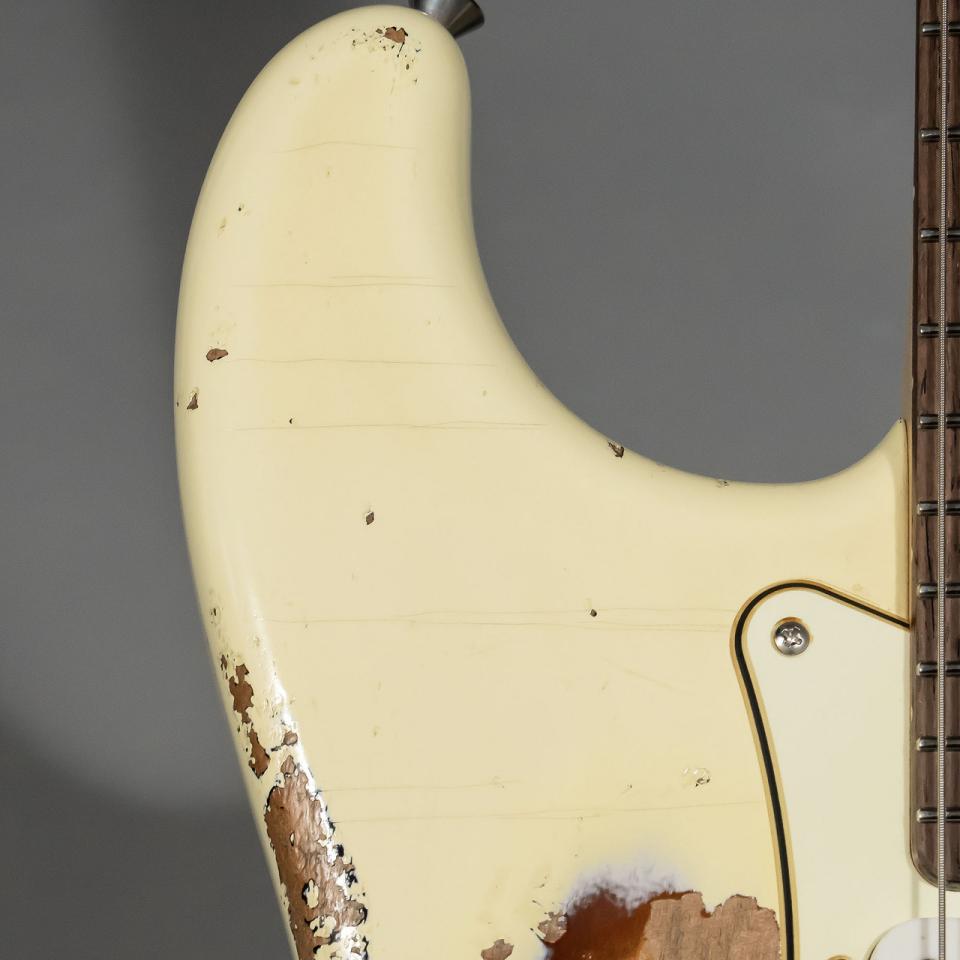 塗装を剥がすエイジド加工だけでなく、パーツのエイジド加工にもこだわりを感じる仕上げで、ピックガード上にピックスクラッチやノブの汚れ、ピックアップカバーの傷や金属パーツの錆やくすみも非常にリアルです。Tsubasa Guitar Workshopのこだわりを間近で感じることができます。