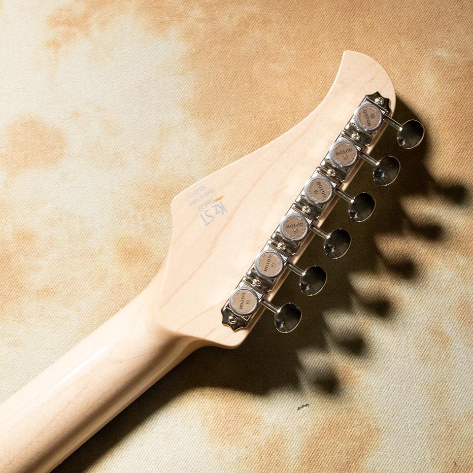 Kz ST Tradといえばネックとボディに高品質なマホガニーを使用していることが売りですが、本機はあえてメイプルネックにバスウッドボディというある種”普通”のマテリアルを採用。