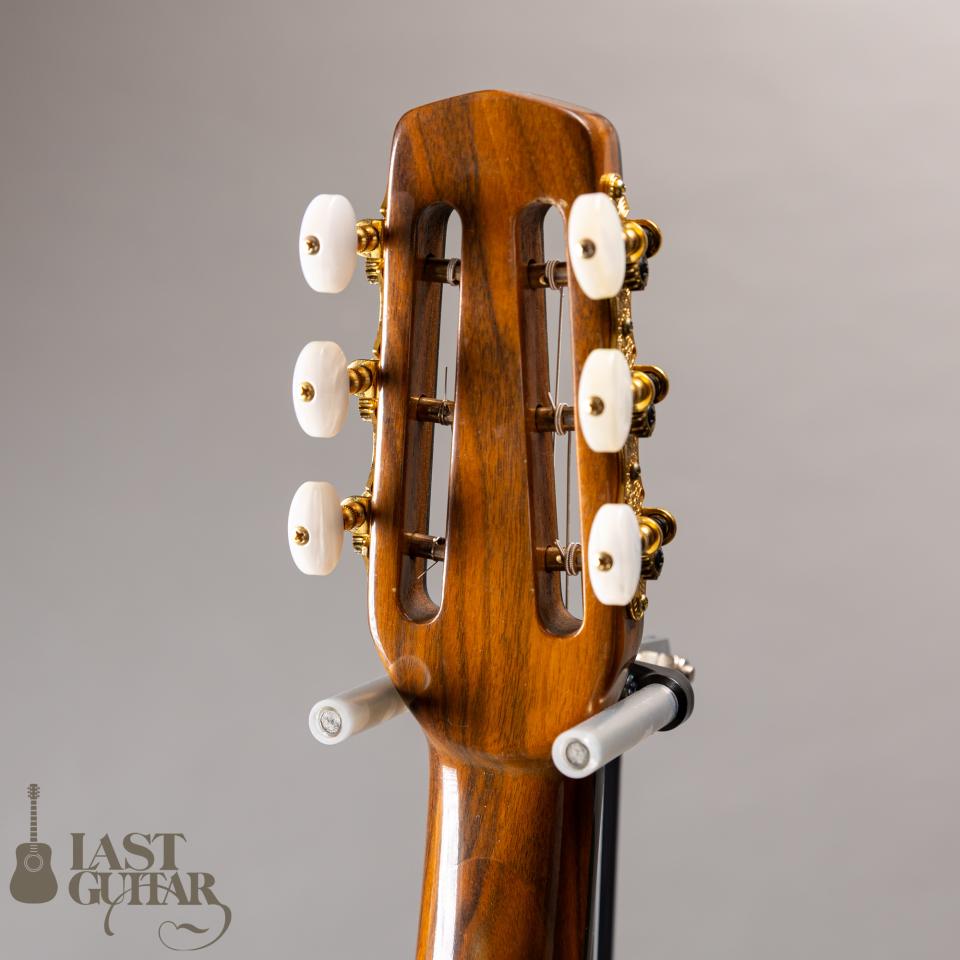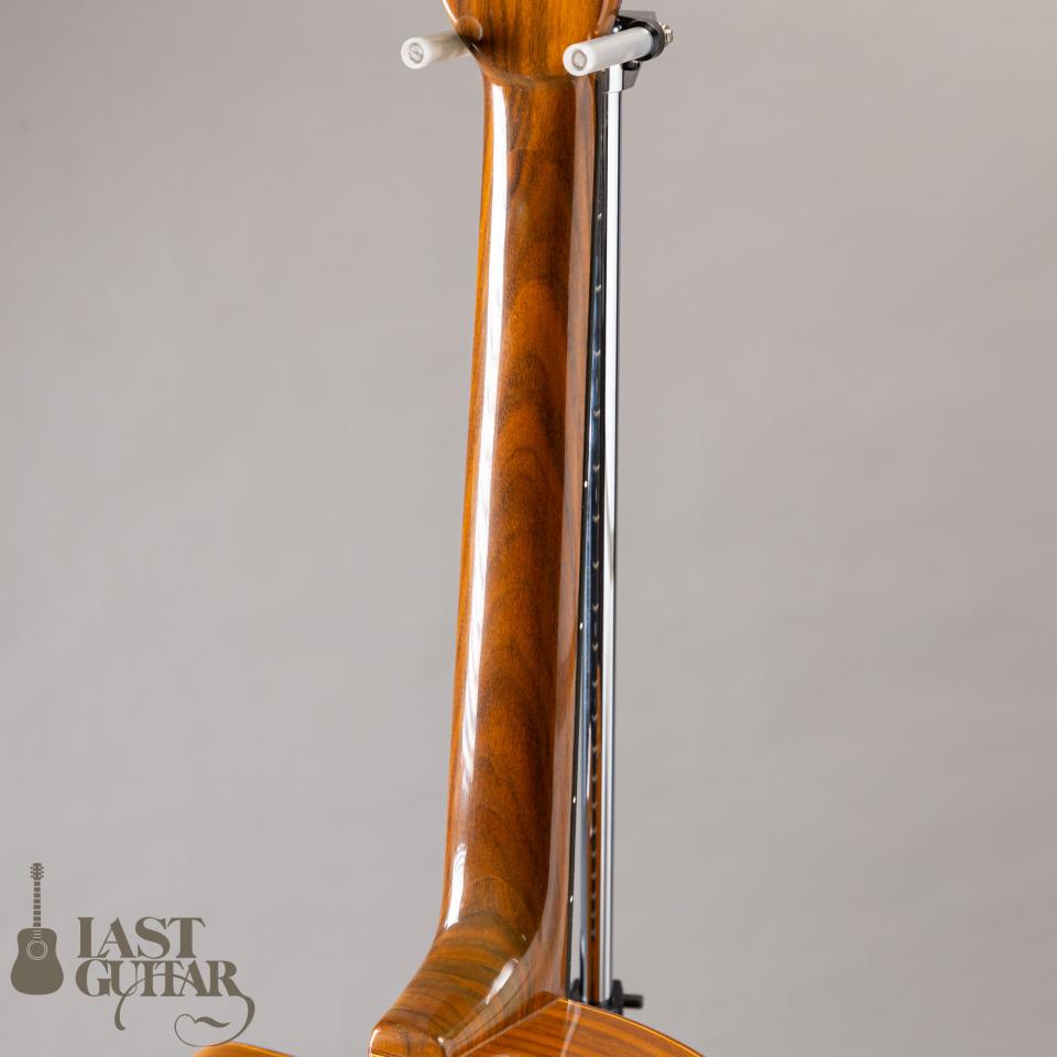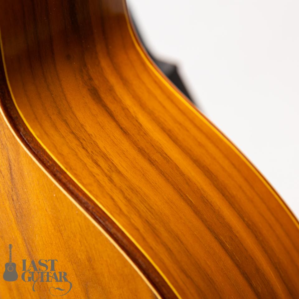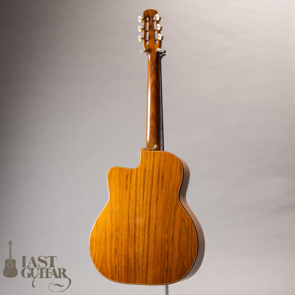 本機は、インサイドラベルより2010年に製作されたダフネモデルです。トップは、目の詰まったソリッドスプルース、サイド、バックは、きれいな木目のラミネートウォルナット、ネックもウォルナットでなかなか雰囲気あります。フィンガーボードとブリッジは、エボニーです。ネックまわりは、約44mmナット幅(0フレット)で、程よい厚みの比較的馴染みやすいDシェイプといった感じです。フィニッシュは、グロス仕上げです。