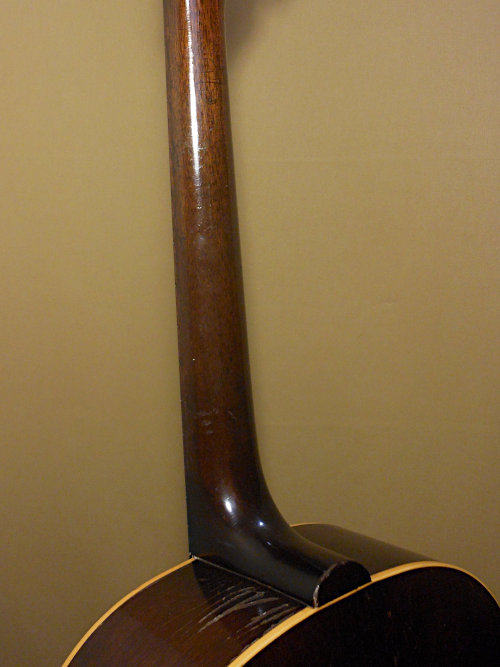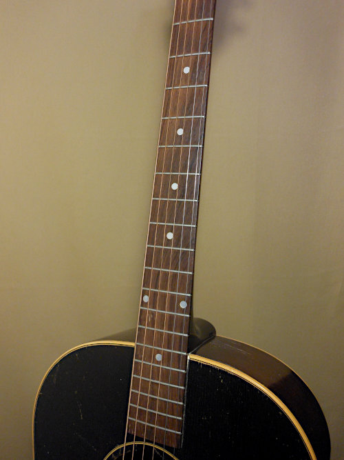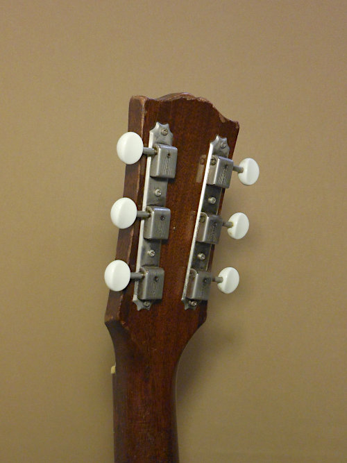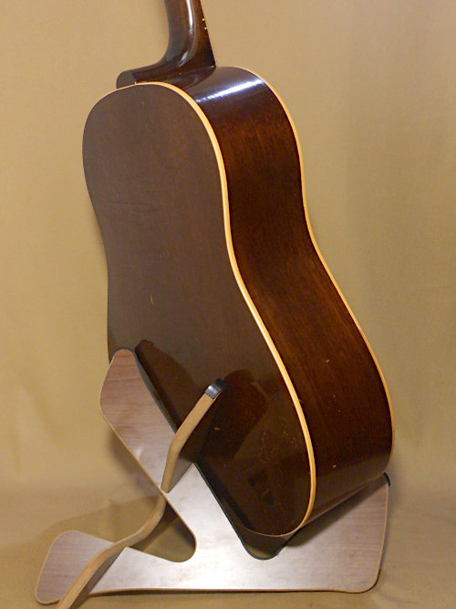 1954年製のビンテージJ-45。スモールピックガード、アッパーベリーブリッジにショートサドル仕様です。フレットなど消耗パーツは交換されていますが、ネック状態も問題なく、ダイナミックな鳴りをストレスなく楽しめるギターです。ズッシリと太く逞しく鳴る低音と明るく乾いた高音で、ガンガンとストロークしたくもなりますが、レスポンス、音抜けもクリア、粒立ちもよいので指弾きにもしっかり応えてくれます。かき鳴らし系のイメージがあるJ-45としては弾き手の幅広い表現力に応えてくれる個体です。ネックはグリップに厚みがあり、ほどよく握り応えのある形状です。表面的にはウェザーチェックが細かく入ったビンテージならではの風格。キズ、塗装の剥げも細かく全体的にみられますが、木部のクラックやその補修痕もなく、70年以上の経過を考慮すれば良好を外観を保っていると思います。