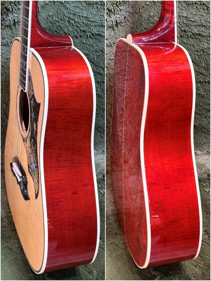 スクエアショルダー・ボディにロングスケールを採用した、伝統的なダヴ・シェイプ。トップは『シトカ・スプルース』、主にアラスカ産を使用し、サイド&バックにはアメリカ北東エリアの『フレイム・メイプル』を使用。ネックにもアメリカ北東エリアの『3ピース・メイプル』。指板は『インディアン・エボニー』を使用。