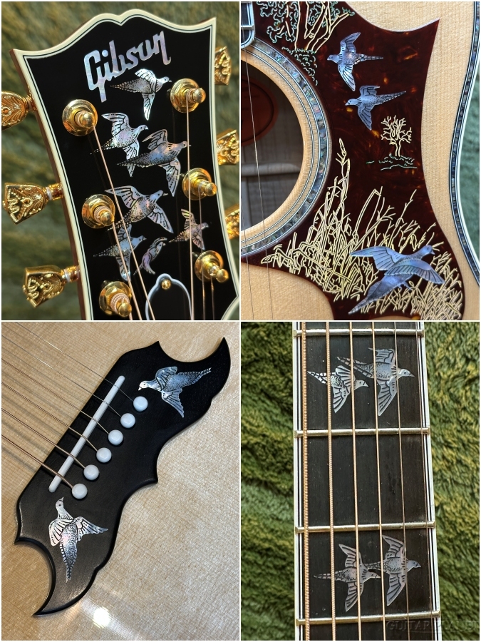 伝説的なDoveのデザインと最上の装飾的なデザインが溶け合い、見る者の視線を釘付けにするDoves In Flight。28羽分のエングレーヴされたダヴ(鳩)のインレイが埋め込まれています。ヘッドストック上に7羽、指板上に16羽、ピックガード上に3羽、そしてブリッジベース上に2羽であり、それぞれが別々の表情をしている点が魅力です。チューナーノブについても、手作業で彫金されている手の凝りようです。