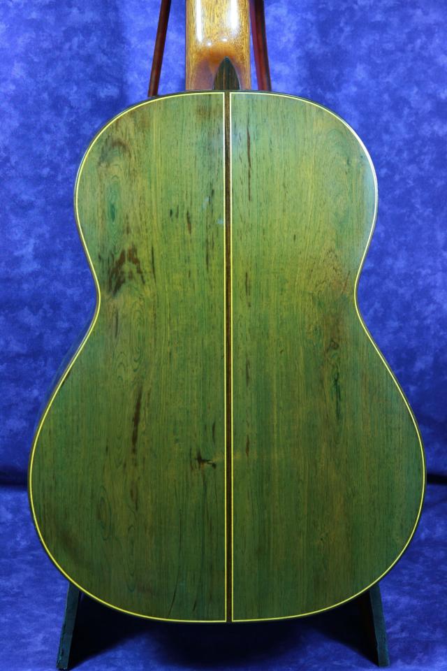 表面板は杢目の揃ったジャーマンスプルースで、サイドバックはかなり上質なブラジリアン・ローズウッド(ハカランダ)です。