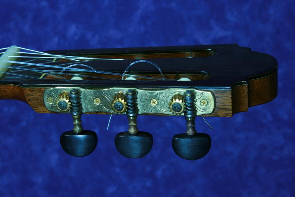 ブリッジとヘッドの飾り板はハカランダです。