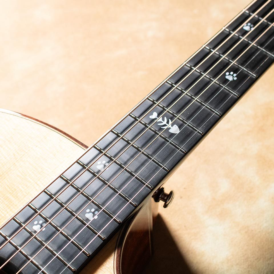 ピックガードやヘッドストックはもちろんながら、指板インレイの足跡がなかなかキュートですね。