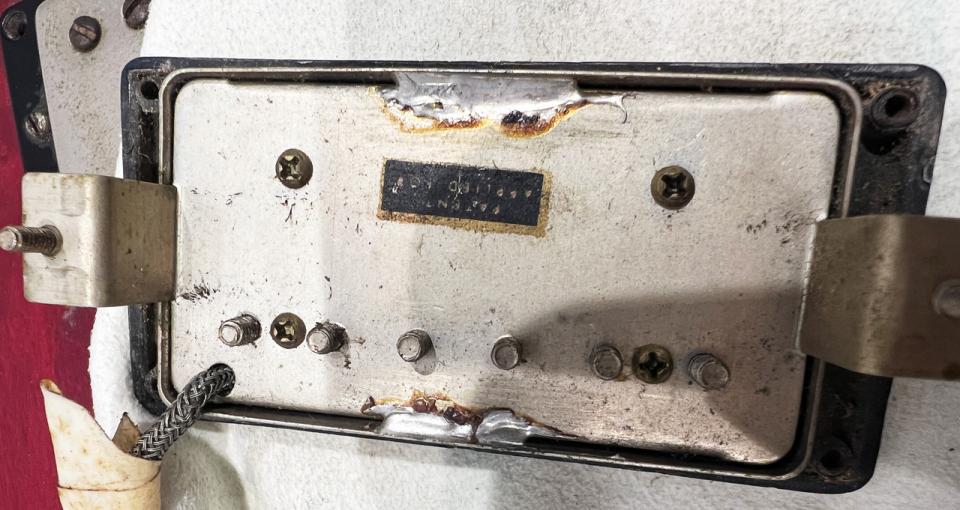 今回入荷したものはオリジナル「PAF」ピックアップを2基搭載しており、ポットもオリジナルであろう、1963年製です。ネックバインディングとインレイ、配線、ペグブッシュは修正されております。ナット、ブリッジ、サドル類は全て新品に交換され、フレットはリフレットしておりますので、オリジナルを求めるコレクター用というよりは、快適な演奏性を求めるプレイヤー向きのコンディションといえます。