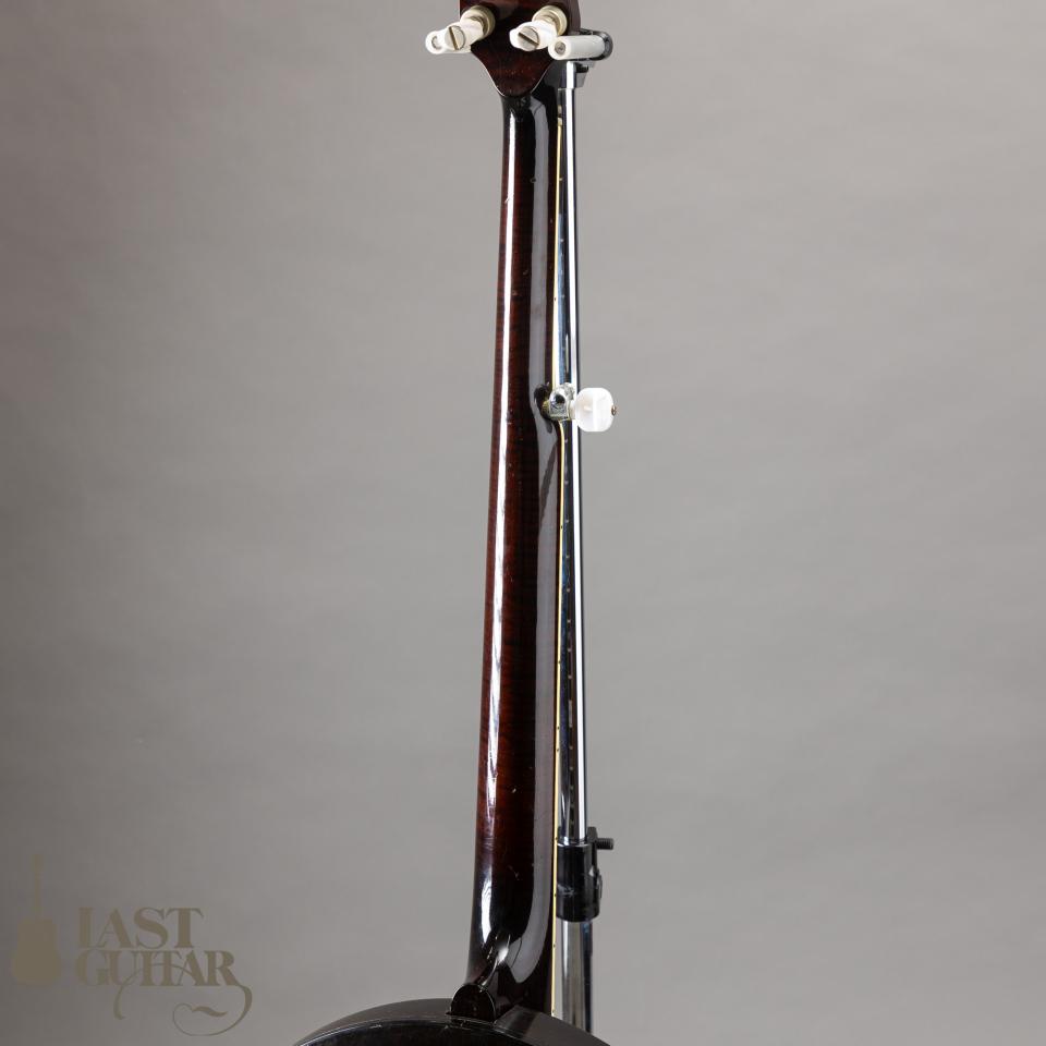 ネックは、フィギャードメイプル材が使用されたきれいなネックがセットされており、雰囲気良くマッチしています。インレイパターンは、トラッドなリースパターンのインレイです。サウンドの肝となるウッドリムは、TB-1でリゾネーターもTB-1です。内部にギブソンのラベルも確認できます。現在、リム上部はカットされてトーンリングが取り付けられておりますので、しっかりとハリのあるサウンドフィールです。
