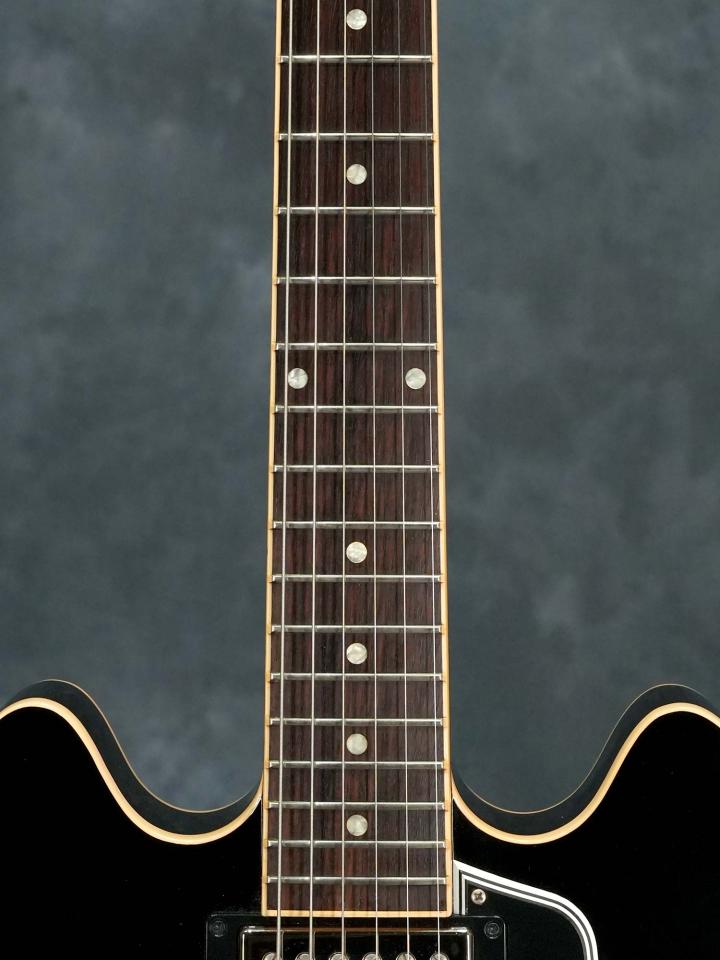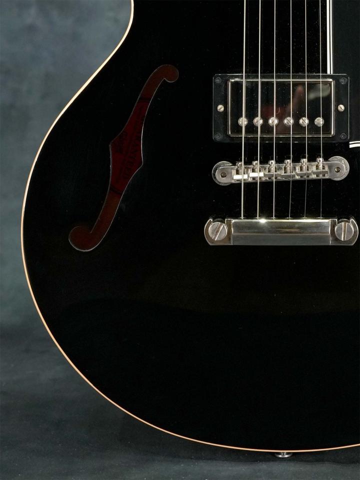ボディの最大幅は約355mmとセミアコの大定番ES-335に比べて二回りほど小さく、一般的なソリッドボディのような扱い易さながらセミアコならではのアコースティック感の有る音色が心地よく、ジャンルを選ばず幅広く使える小ぶりなセミアコをお探しの方にオススメの一本です。