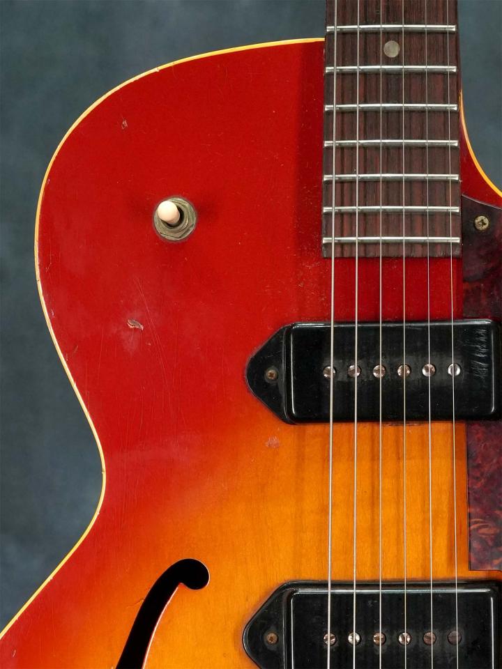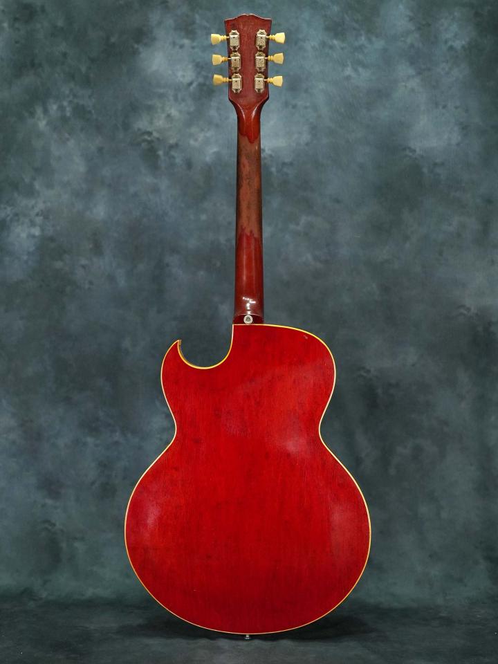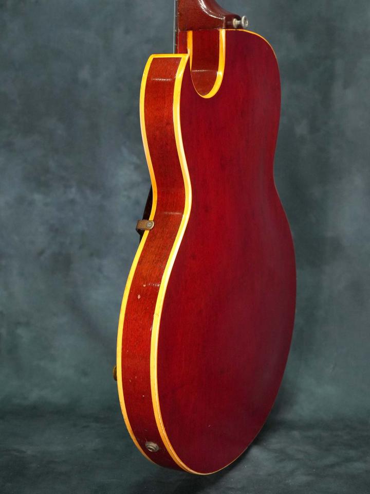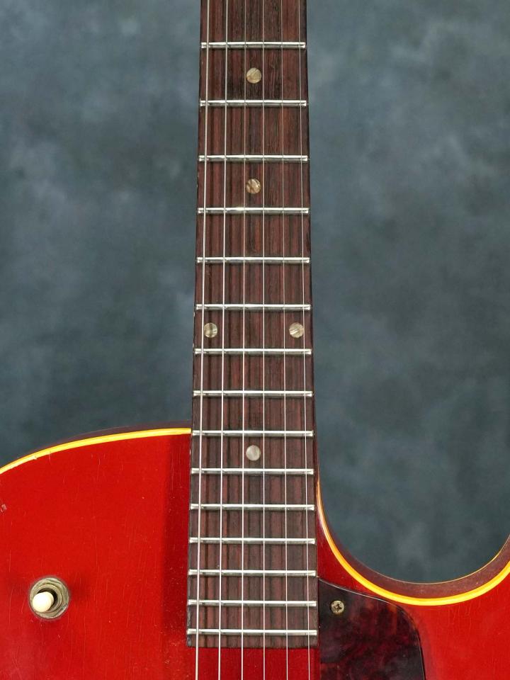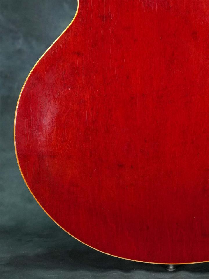 60年代ならではの鮮やかなチェリーサンバーストで、経年により全体にはびっしりウェザーチェックも入った貫禄のルックス、リフレットされている事で演奏性も良く、ジャズやブルースで活躍する枯れた音色が心地良いフルアコをお探しの方にオススメの一本です。