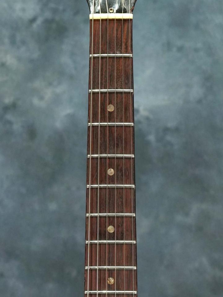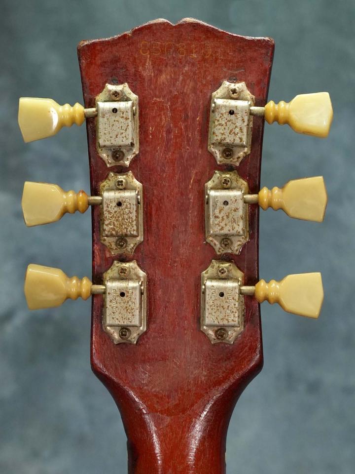 シリアルナンバーは1966年or1969年、確認出来るポットデイトは1966年、コンデンサはフロント&リア共にオリジナルのSPRAGUE ブラックビューティーでハンダを付け直した形跡も有りません。ヘッド裏の塗装が傷んでおり、使い込まれた事でネック裏は大きく塗装が剥がれています。テールピースは交換されていた時期があるようでボディエンドには現在のテールピースとは別の物が取り付けられていたビス穴が空いています。