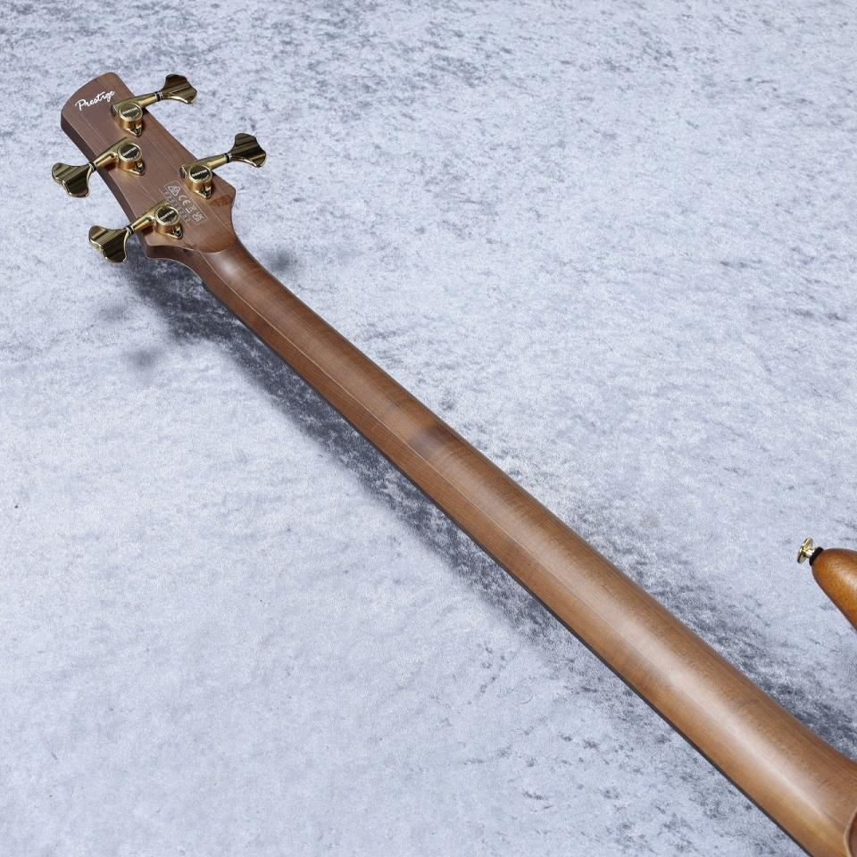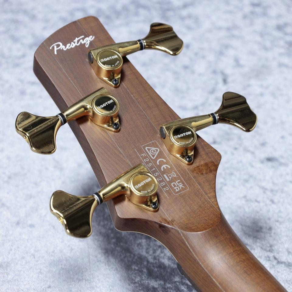 窒素加熱処理技術である"エステック処理"されたメイプル材とウォルナット材を組み合わせたネックにローズウッド指板、アフリカン・マホガニー材ボディ・バック、オヴァンコール材ボディ・トップといったウッドマテリアル。