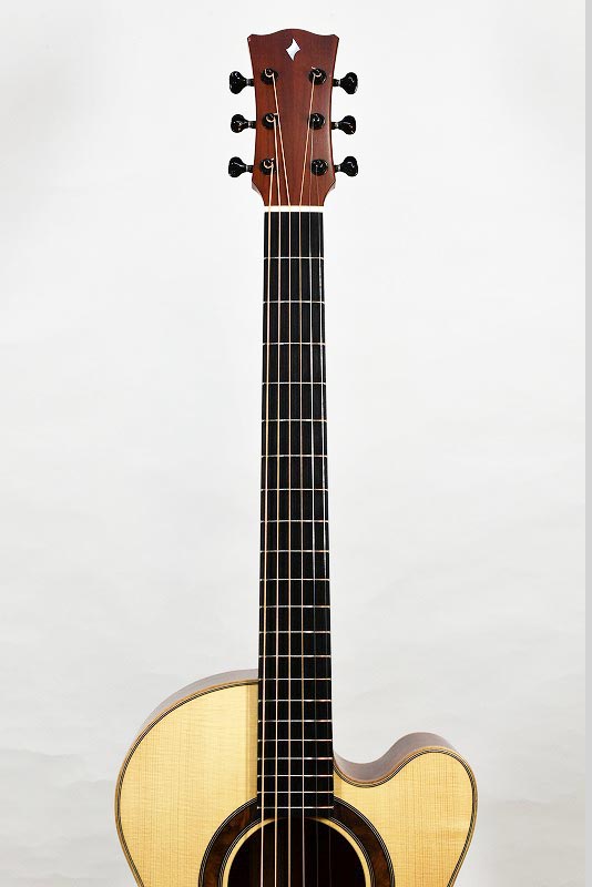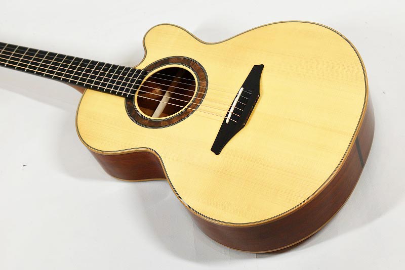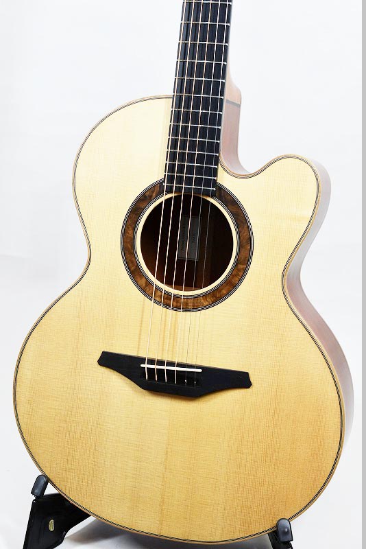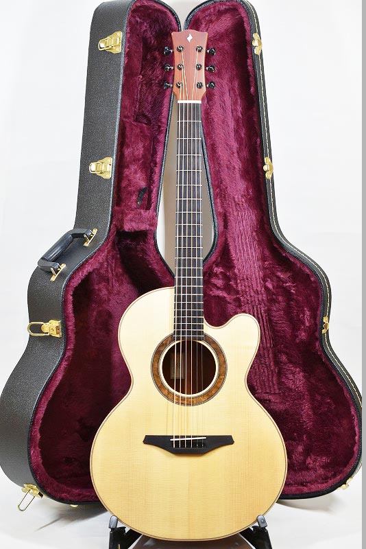 仕様としては、スプルーストップxパデュークサイド&バックと思われ、約15インチ程のボディワイドと丸みを帯びたベネチアンカッタウェイスタイルとなるアコースティックギターです。