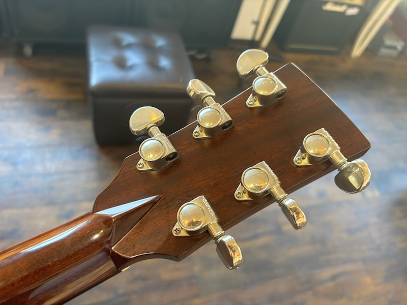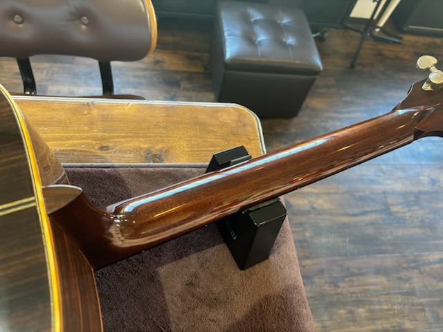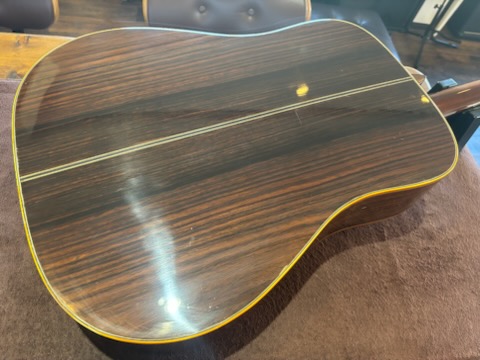 当時のカタログではトップのスプルースは単板、サイド&バックのローズウッドは単板の記載はありませんが、サイドの内側に割れ止めを施している点や、バックの木目の感じも単板のように観えますが確証はありません。