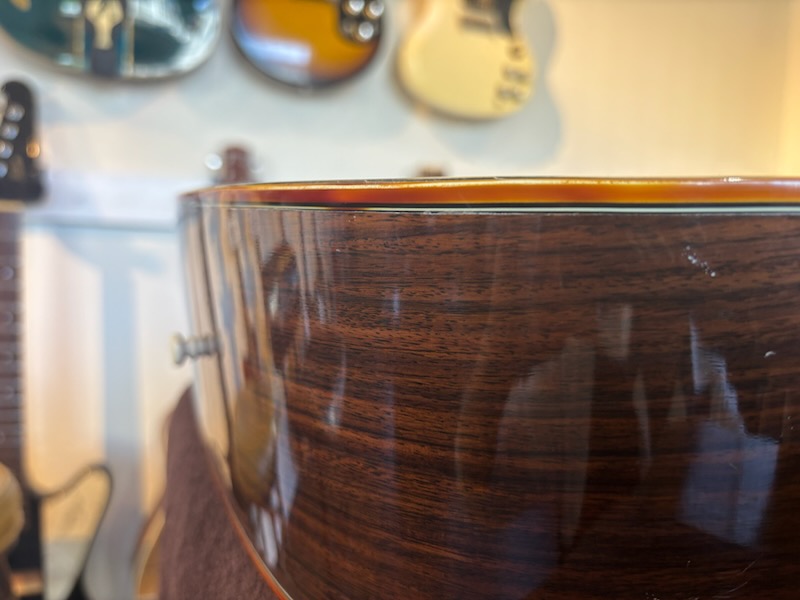 またボディ・トップのロゼッタからブリッジにかけてクラック(画像11枚目)が、ボディ・バック1弦側の窪みの箇所のバインティングが若干ですが一部剥離(画像15枚目)しています。