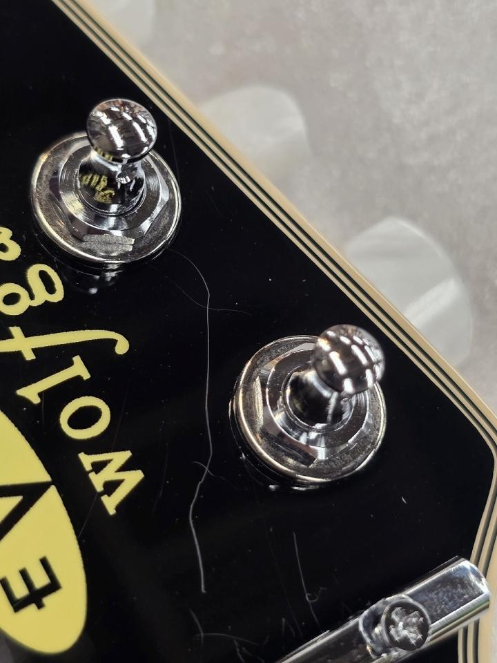 ピックアップセレクターの3ウェイトグルスイッチはリバースタイプで、正面から見て左がリア、右がフロントです。また、。赤ボタンのキルスイッチで "You Really Got Me "のようなスタッターストップが可能。