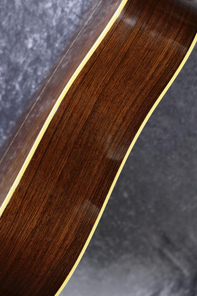 そして、ハカランダ(ブラジリアン・ローズウッド)を使用したサイド&バックは、このD-28を特別な存在にしています。ハカランダは、その深く、豊かな音響特性により、弦が振動するたびに音が複雑に広がり、持続性と響きの強さを生み出します。ブラジリアン・ローズウッドの力強い低音とクリアな高音が、シトカスプルースの透明感のある音色と見事に調和し、深みのある音の層を作り出しています。