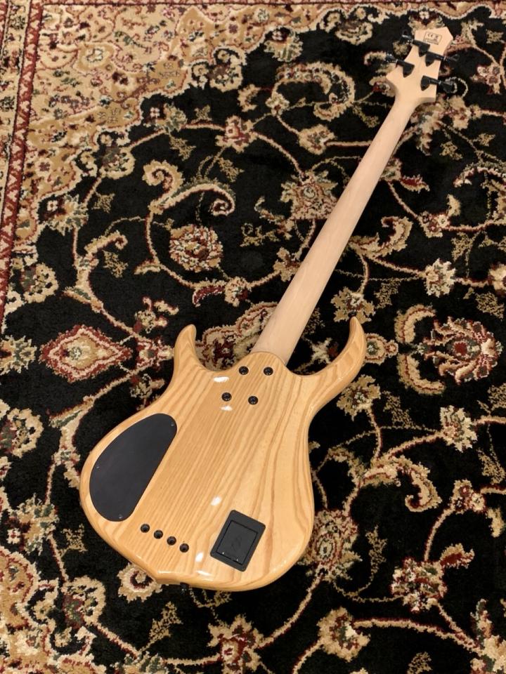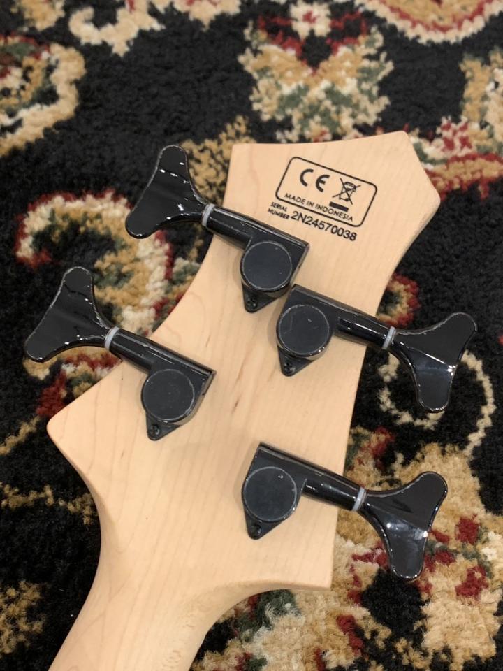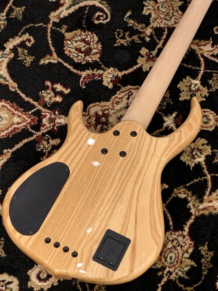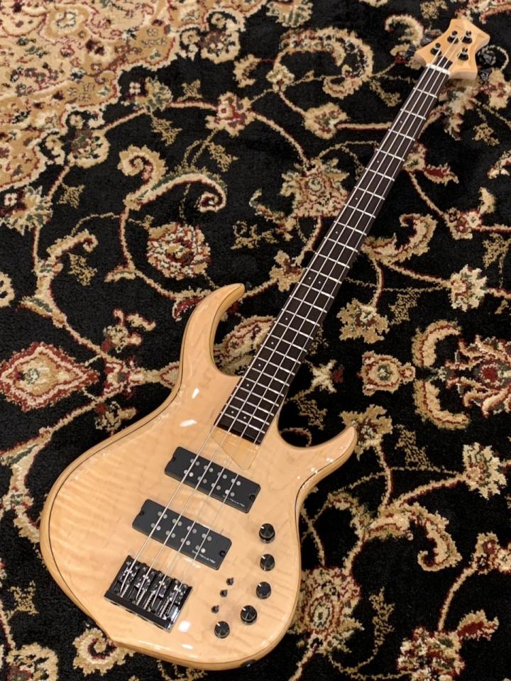 今回紹介の1本はオリジナルシェイプを用い、フレイムメイプルトップにアッシュ材をボディバックに使用したモデル。メイプルネック、24フレットのエボニー指板のネックのボルトオン構造。指板サイドは角を落としたロールド・エッジ加工を施しておりスムーズな演奏性が特徴になります。ナット幅を38mmのジャズベースと同様とすることで演奏性の両立を図っています。