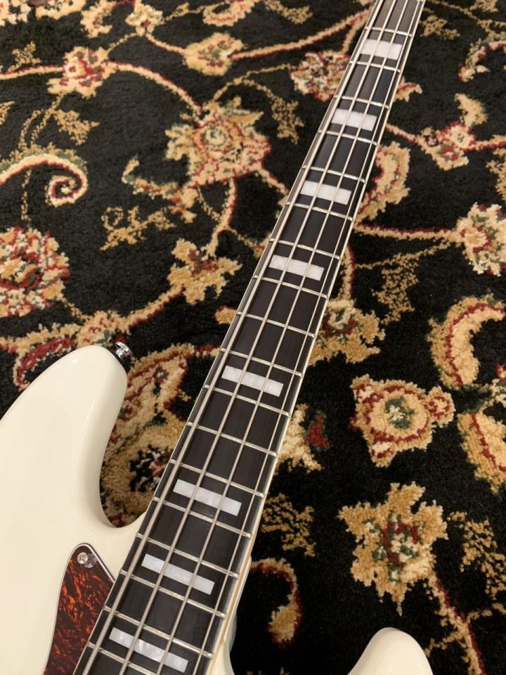 今回紹介の1本はアルダー材をボディに採用したJBモデル。メイプルネックにエボニー指板にブロック・ポジションマークとバインディングを施したネックを4点止めプレートジョイントとしています。指板サイドは角を落としたロールド・エッジ加工を施しておりスムーズな演奏性が特徴になります。トラディショナルな20フレット仕様ながら9.5インチの指板ラジアスとなることで、サウンドと演奏性の両立を図っています。