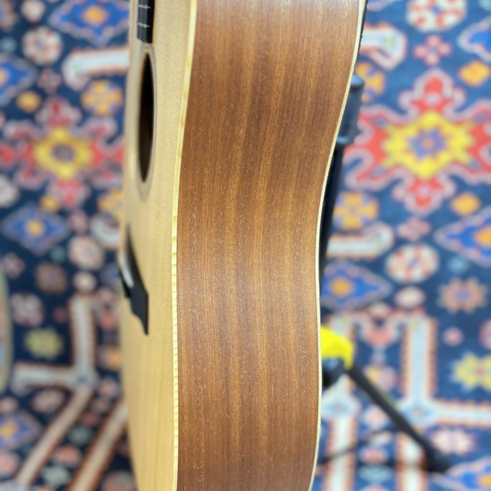 1-11/16インチの狭めのナット幅でフレットに余裕を持たせ、なめらかで弾き心地のいいアームレストを採用しており、初めてのTaylorでもすぐに馴染める仕上がりになっています。
