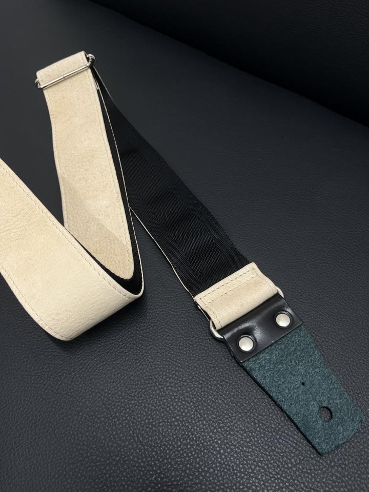 表面はレザー、裏面はシートベルトのようなツルツルとした質感の生地のストラップです。