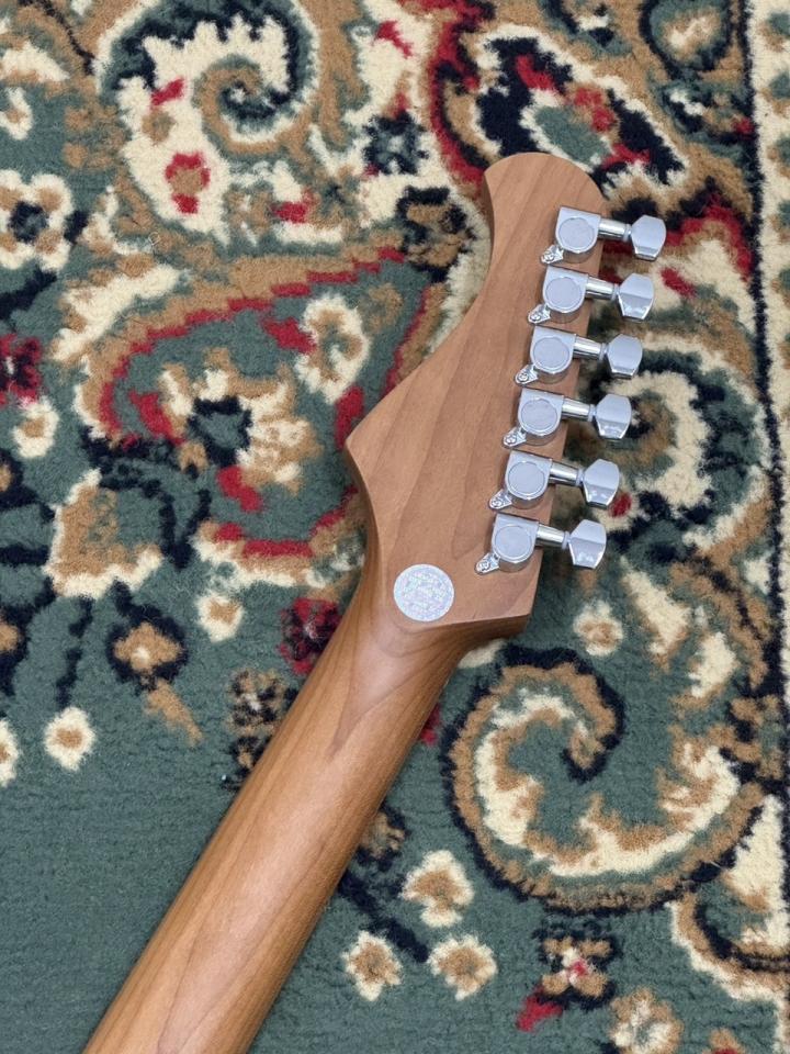 ローステッドメイプルとはメイプルを高温で加熱処理して材の中の水分や油分を揮発させることにより木材を経年変化した状態に人工的に近づけた材のことです。経年変化が進んだ材は歪みやねじれが生じにくくなります。ネックに使用されるとその効果は安定性だけでなくサウンドにも及び、豊かな生鳴りと経年変化したビンテージのようなこなれたトーンを生み出します。一般的に高級機種などで用いられる材ですが、手に取りやすい価格帯に落とし込むことに成功しました。