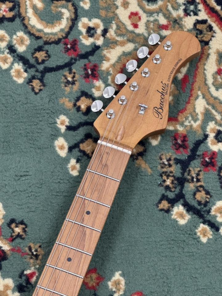 ネックにはBacchusの新機軸でもあるローステッドメイプルを採用。ローストする工程上でゆがみが生じてしまうような木材はその時点で淘汰されるため、ネックとして搭載されている個体は非常にゆがみやねじれに強く、取りやすい価格帯ながら長い間ご愛用できる仕様となっております。