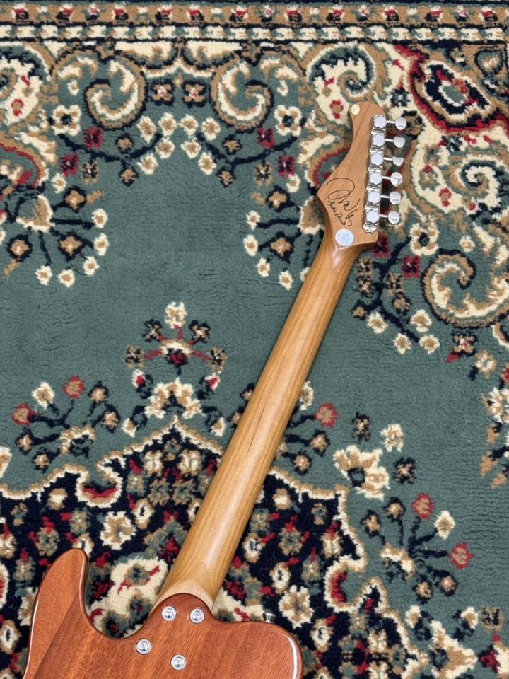 ボディトップには美しい杢目が印象的な「フレイムマホガニー」を採用しています。カラーにはアンドレの愛用するカスタムモデルを再現したブルーバーストに加え、チェリーサンバーストもラインナップ。アンドレの求めるサウンドに近づけるため、ボディにはマホガニーに近く、中音域に特徴のあるオクメ材を用いています。