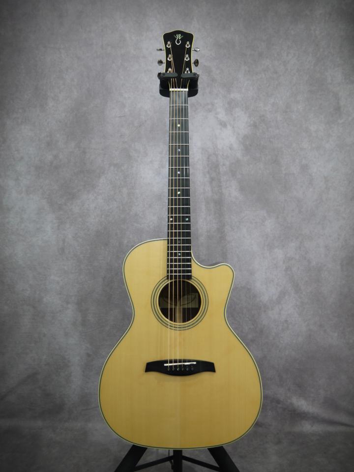 製作は中国で行われていますが、素材・構造・仕上げにおいて非常に高いレベルで追求されており、特にアコースティックギターにおいてはテーブルトーン・ボイシング(トップ材の厚み調整)や“スキャロップド・ブレイシングを採用し、豊かな倍音・レスポンス・弦からの振動伝達を実現しています。