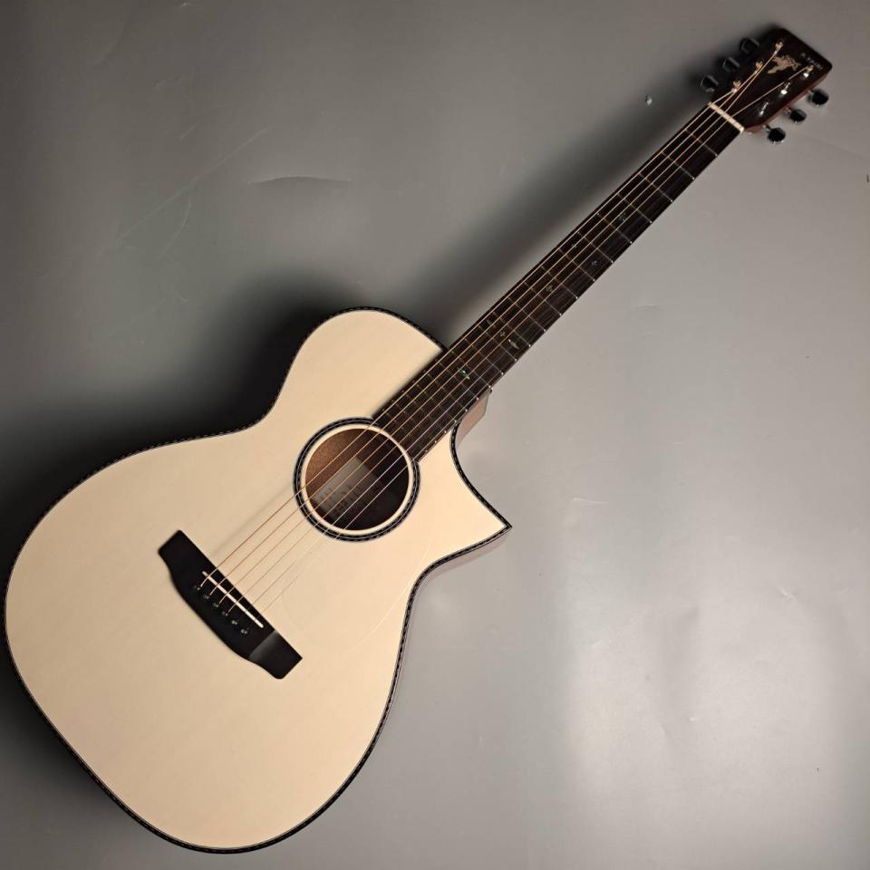 ラベルに貼られている型名は「YF O18B」。シングルOの18をベースにしているというとわかりやすく、材質はシトカスプルース単板トップ、サイドバックマホガニー合板となっています。そこにフローレンタインのカッタウェイを施し、なんといってもホワイトブロンドのトップカラーが映える1本となっています。スケールは635mmと短く、仙台泉店の女性スタッフが企画しただけあって、女性に寄り添った仕様になっています。低音こそ出づらいですが、温かみのある優しい音色が特徴です。ピックアップも搭載しており、すぐにライブでも使うことができます。ヤイリはアコースティックのものが多いので、これは嬉しいポイントですね。弾きやすいギターをお探しの女性の方に是非お勧めしたい1本です!
