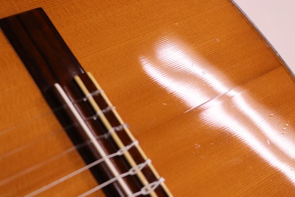 所々小傷があり、表板センターに少しクラックがございますが、全体的には年代を考えると綺麗な状態です。メイプル材らしく落ち着いた味わい深い鳴りで、どこか19世紀ギターを思わせる大変美しい音色が魅力的です。ネックはほぼストレート(わずかに順反り方向)、弦高は12F上6弦側約3.9mm、1弦側約3.0mmと標準的な弦高。ネックがやや薄めかつナット幅が狭めな設計で、弦のテンションも弱めなためとても弾きやすい印象です。