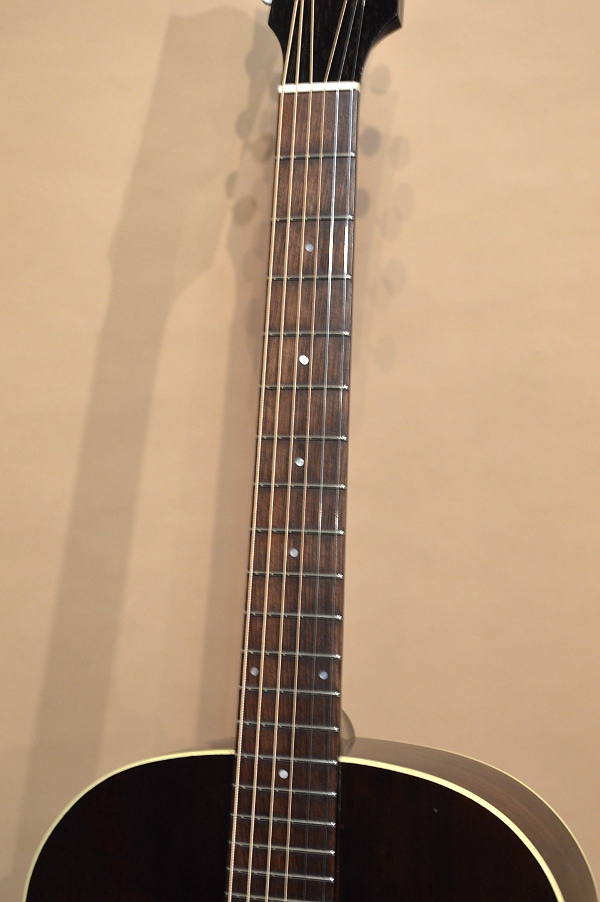 アディロンダック・スプルースTOP(トリファイド)、マホガニーSIDE&BACK、マホガニーNECK、マダガスカル・ローズウッド指板&ブリッジ、オリジナル・スキャロップドXブレーシング、実測43.4mmナット、24.75インチ・スケールの16インチ・ラウンド・ショルダー。接着はニカワ接着、塗装も木に馴染む極薄塗装で仕上げられた雰囲気バツグンの1本です!