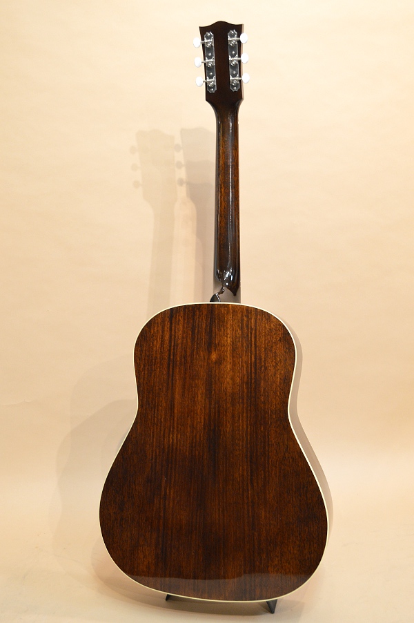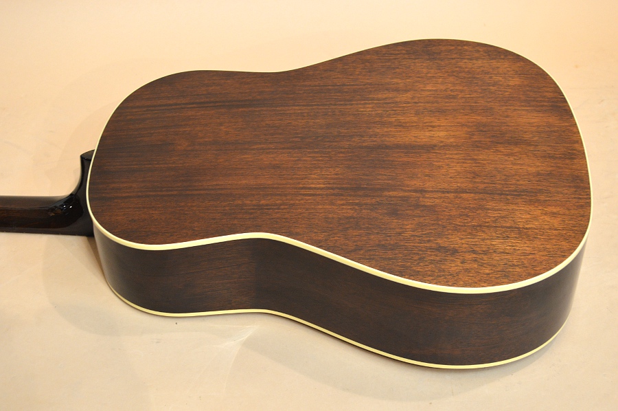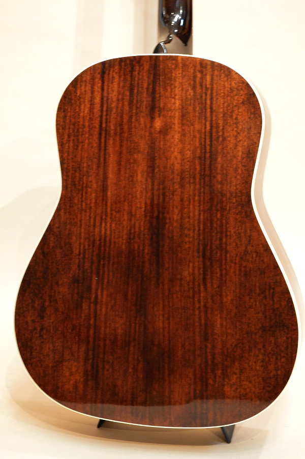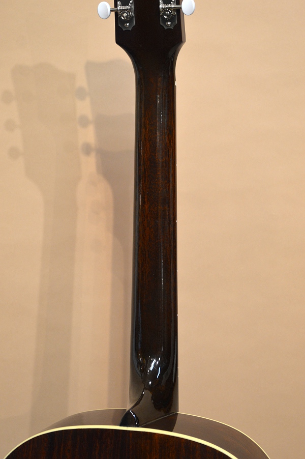 そして驚きはそのサウンド!ほんとにプリ・ウォー・ギブソンを弾いているような錯覚に陥ります。バウンとラウドに鳴るローにパワフルなミドル、ガツンと立ち上がるハイなどが混然一体となり、パワフルで豪快なサウンドを響かせます。数多いるギター・ルシアーの中で、これほどまでにプリ・ウォー・ギブソンに肉薄したルシアーも珍しいんじゃないかと思います。マーチン・スタイルもギブソン・スタイルもどちらも作ります!的なルシアーのギブソン・スタイルとは全く別物の、ギブソン愛一直線なサウンドです(笑)!あのプリ・ウォー・ギブソンのガランガランと豪快に鳴るサウンドが見事に再現されていて、驚くほどの音の太さとパワーが感じられます。言い方を替えればプリ・ウォー・ギブソンのような大味なサウンドとも言えますが、、、弾いてみたらびっくりする事間違いなしの完成度の高いサウンドです!
