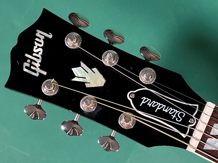 ペグは交換されており、現在はオープンバックの GOTOH 製 “SX510” が搭載されています。くすみはあるものの動作はスムーズで、交換の必要もなく問題なくチューニングできます。また、【Standard】と刻まれたトラスロッドカバーへ交換されています。